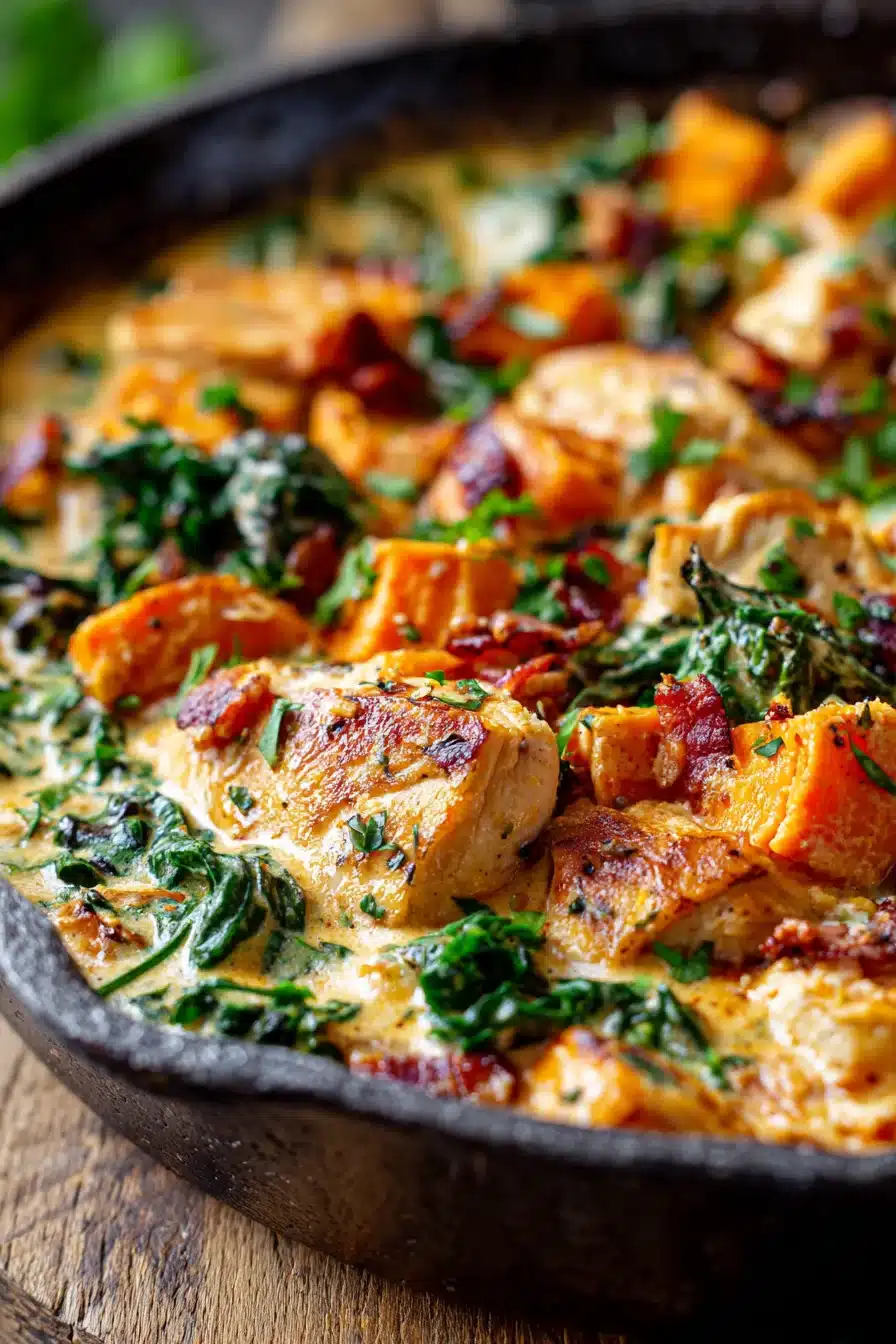 If you’re looking to mix up the flavors of your Creamy Chicken Sweet Potato Skillet, consider adding spices like smoked paprika, curry powder, or garlic powder to the cream sauce for an extra flavor punch. Incorporating fresh herbs—such as rosemary, thyme, or sage—can also elevate the dish with fresh, aromatic notes.