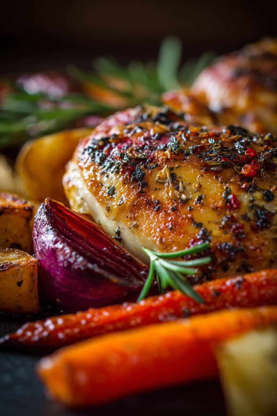 Serve: Toss the roasted root vegetables gently with fresh parsley, carve the chicken, and serve hot alongside the vibrant vegetables. For an elevated touch, drizzle pan juices over the plate.
